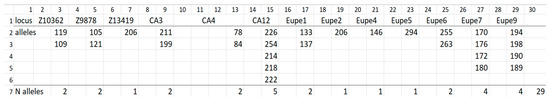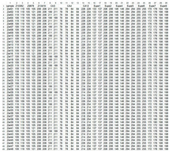 The forward primer of each primer pair was the 5′-end labeled with fluorescent dyes (6FAM, VIC, NED, PET). The lengths of the amplified DNA fragments were determined using an Applied Biosystems 3130 Genetic Analyzer against GS400LIZ size standards. Allele determination was performed using GeneMapper 3.0 software (Applied Biosystems, Waltham, MA, USA) according to the manufacturer’s recommendations.