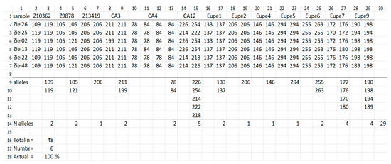 The example of the result file calculated for the Zielonka (ZI) population (Figure 3) shows the genetic profiles of six samples. They enable transfer of 100% of allelic diversity, which are given below the line “selected sample” and the heading “sample”. They are the following: Ziel07, Ziel22, Ziel26, Ziel25, Ziel38 and Ziel48. The subsequent list provides alleles of a given locus, as well as across loci in a group of selected samples.