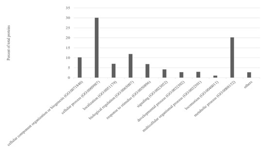 | GOID | Description | Functional Group * | p-Value § | % of Associated Proteins ¥ | N. of Proteins | Up or Down Regulated Proteins ● |
