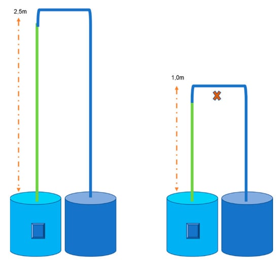 An inverted U-Shaped simulation experiment of blood circulation from the heart to the head and back to the heart was conducted against an outdoor wall. An experiment conducted by [23]) to test if a siphon can operate in the sauropod dinosaurs will be used as a guide to fit the neck measurements of a giraffe (2.0 m) and ostrich (1 m). The siphon mechanism was tested by simulating blood flow from the heart via the carotid artery to the brain and returning blood from the brain via the jugular vein back to the heart. The tubing represents arteries and veins in a giraffe and ostrich with the neck raised from ground level to an upright posture. Plastic PVC tubing (10 mm diameter) was constructed against an outside wall (Figure 2). A tape measure was used to measure 1 m and 2 m height from ground level, indicated by the orange dotted lines with arrows, to represent neck length, i.e., distance from the heart (ground level) to the head, in ostrich and giraffe, respectively. A 10-litre bucket was filled with water (temperature of 25 °C), and a submersible electric pump (Grech HJ-542) was fitted to the plastic piping and placed at the bottom of the bucket, providing constant pressure. The turquoise bucket with the pump, indicated by a blue block, represented the heart pumping blood towards the brain, indicated by the red cross. The green line indicates the carotid artery. Three variations of tubing were used to represent the jugular vein section (blue line), to test blood flow in (1) non-collapsible PVC tubing, (2) collapsible tubing, (3) collapsible tubing with a siphon section add-in, indicated by a red line, at cranial level (Figure 3). The siphon section add-in was 60 mm long for the ostrich and 100 mm for the giraffe. A bucket with markings representing the jugular vein was placed at ground level at the outlet end of the tube to measure water pumped through the inverted u-tube structure. The pump was started and ran for 1 min, whereafter it was switched off. Water flow was measured for 1 min with the amount of water in the receiving bucket measured. Water flow measurements for both the ostrich and the giraffe were repeated ten times for each of the three variations and were calculated in litres per second.
