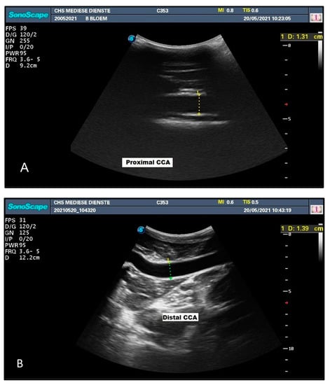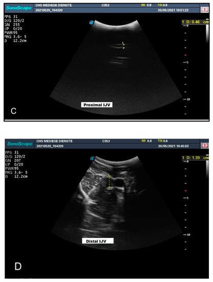 Diameter of the proximal (A) common carotid artery (CCA) with head lowered and distal (B) common carotid artery with head in the upright position. Diameter of proximal (C) internal jugular vein (IJV) and distal (D) internal jugular vein in an upright head position. Diameter of proximal (E) internal jugular vein (IJV) and distal (F) internal jugular vein in a head-lowered position.