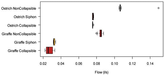The Pairwise Wilcox Test was implemented to investigate non-parametric differences between groups. Table 4 shows the differences between groups. All the groups showed significant differences between groups except for the ostrich group, where the siphon data were not significantly different from the collapsible tube data. This might be due to the short cranial structure not having a notable effect on the relatively more straightforward neck of the ostrich, with the effect only notable at a longer neck length, such as in the giraffe’s case.
