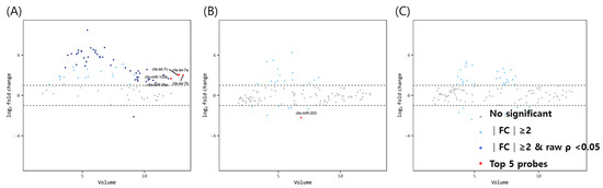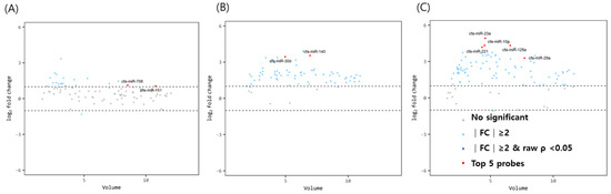 Volume plots of miRNAs in (A) ovary, (B) oviduct and (C) uterus of dogs older than 3 years old with uteropathy compared to healthy dogs older than 3 years old. The volcano plot shows the fold change and according volume of the miRNAs between the two groups. The horizontal line displayed a 2-fold change differences. Gray dots mean no significance for comparison between volume and fold change value. Sky blue dots mean above 2-fold change differences without p < 0.05. Navy blue represents significant fold change and p < 0.05. cfa-miR = Canis lupus familiaris microRNA. Red dots mean significant top five miRNAs for comparisons.
