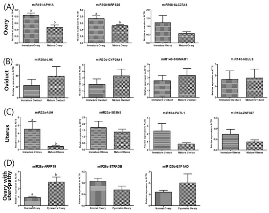 Validation of the differentially expressed levels of each predicted of miRNA of (A) ovary, (B) oviduct, (C) uterus and (D) ovary of dogs with uteropathy. (A) The differentially expressed miR in ovary was cfa-miR-151 and cfa-miR-708. The cfa-miR-151 is expected to target APH1A, cfa-miR-708 target MRPS35 and SLC37A4. (B) The differentially expressed miR of oviduct is cfa-miR-30d and cfa-miR-140. Their predicted target is LHX8 and CYP24A1 of cfa-miR-30d and SIGMAR1 and HELLS of cfa-miR-140. (C) The differentially expressed miR in uterus was cfa-miR-23a and cfa-miR-10a. The cfa-miR-23a is expected to target SESN3 and AUH, cfa-miR-10a target PATL1 and ZNF367. (D) The differentially expressed miR of ovary with uteropathy is cfa-miR-26a and cfa-miR-125b. Their predicted target is ARPP19 and STRADB of cfa-miR-26a and E1F1AD of cfa-miR-125b.The gene expression was validated by performing quantitative real-time PCR. The data is shown as mean ± SD, p < 0.05. cfa-miR = Canis lupus familiaris microRNA.