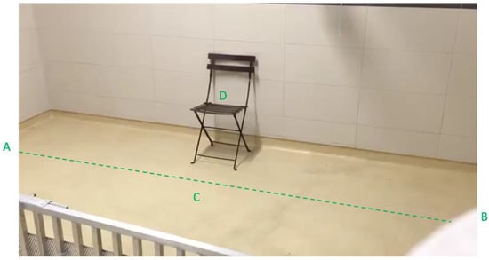 C.D. explained the precise procedure to C.C. in the absence of the puppies. The room was familiar for the puppies, but was emptied for the experimental purpose (see Figure 1). Thus, each puppy had 15 min to explore the room freely in order to become familiar with its emptiness, divided as follows: 13 min all together with their mother to avoid stress, then 2 min alone.