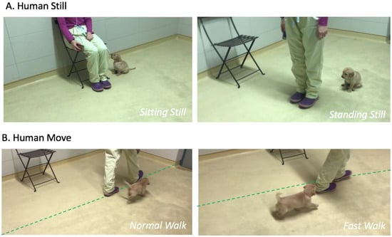 - Human Move Condition: The human experimenter was walking without interacting with the puppy (40 s).