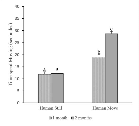 Time spent moving by the puppies. Puppies generally moved significantly more when the experimenter was walking compared to when she was still. The moving behavior of one- and two-month-old puppies did not differ when the experimenter was still (LME with permutation test, p > 0.05); however, it did significantly differ when she was moving (LME with permutation test, p = 0.000). Graphics represent means + standard errors (seconds). Different letters mean significant differences.
