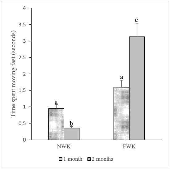 Time spent moving fast by the puppies. Two-month-old puppies exhibited significantly more trotting and running when the experimenter was walking at a fast pace compared to a normal pace (LME with permutation test, p = 0.000), whereas one-month-old puppies did not exhibit such a difference (LME with permutation test, p = 0.072). NWK: Normal walk, FWK: Fast walk. Graphics represent means + Standard Errors (seconds). Different letters mean significant differences.