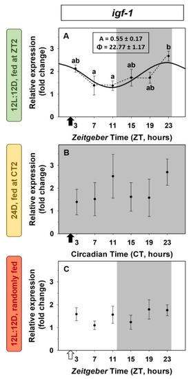 It is recognized that the actions of IGF-1 appear to be critically dependent on the hormonal and nutritional environment, but the relevance of the temporal organization of the IGF-1 axis has not been explored thoroughly. It is well known that a broad range of biological processes exhibit daily rhythmicity that has evolved to cope with natural environmental cyclic variations. This internal timing system confers adaptive advantages as it allows animals to anticipate and synchronize with periodic environmental variations [33]. In fish, studies on rhythms in the somatotropic axis have mainly focused on plasma GH. Daily rhythms of plasma IGF-1 in the channel catfish and liver igf-1 mRNA expression in gilthead sea bream, rabbitfish, tilapia, zebrafish, and Senegalese sole have been described [34,35,36,37,38,39]. However, it is unknown whether these daily variations are exogenous or are entrained by predictable cues. In addition, very little is known about possible rhythmic variations in the rest of the key elements that constitute the IGF-1 system, i.e., the receptors and the IGFBPs.
