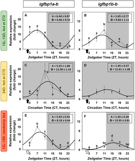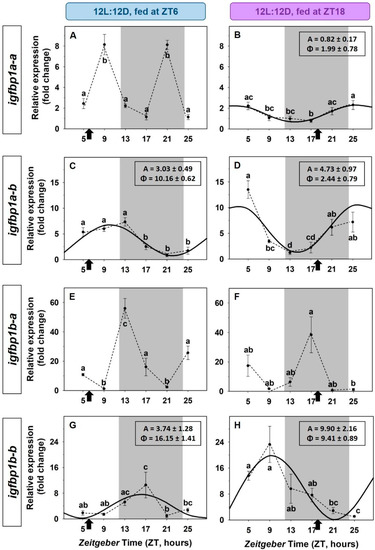 The effects of a 12 h-shift in feeding time on the expression of igfbp1 and igfbp2 paralogs are shown in Figure 6 and Figure 7, respectively. The expression of the igfbp1a-b and igfbp1b-b paralogs showed significant daily rhythms of similar amplitudes that shifted when the zeitgeber feeding time was 12h-shifted (Figure 6C,D,G,H). It is found that the amplitude of these rhythms was higher in fish entrained by feeding time at mid-dark compared to fish fed at midday. The daily expression of igfbp1a-a in fish fed at midday showed two peaks: at the end of photophase and at the end of scotophase, this profile is suitable with an ultradian rhythm (Figure 6A), but it is modified to a low amplitude 24-h sinusoidal rhythm when food was provided at the mid-dark (Figure 6B). The expression of igfbp1b-a showed statistically significant differences throughout the 24-h (ANOVA), but it did not fit sinusoidal rhythmic waves in any of the two mealtime conditions, midday (Figure 6E) and mid-dark (Figure 6F).