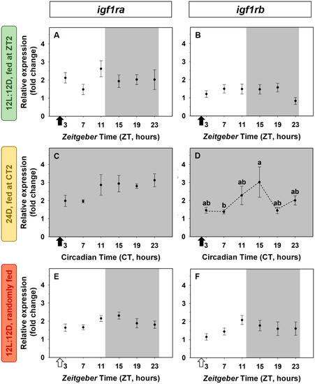 Daily variations of igf1ra (A,C,E) and igf1rb (B,D,F) expression in the liver of goldfish. (A,B) Standard conditions group (12L:12D photoperiod, feeding time at ZT2); (C,D) 24D group (24 h darkness, feeding time at CT2); (E,F) random feeding group (12L:12D photoperiod, randomly fed). Data are expressed as mean ± s.e.m. (n = 7/sampling time). Different letters indicate statistical differences among sampling times (ANOVA). Dashed lines represent significant differences among sampling points by ANOVA. Black arrows indicate feeding time. White arrows indicate the time of the last feeding. The dark period is represented in grey.