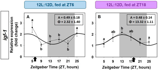 Effect of a shifted mealtime on the daily expression of igf-1 in the liver of goldfish. (A) ML group (fish fed at the mid-photophase, ZT6). (B) MD group (fish fed at mid-scotophase, ZT18). Data are expressed as mean ± s.e.m. (n = 6/sampling time). Different letters indicate statistical differences among sampling times (ANOVA). Sinusoidal waves represent significant rhythms by Cosinor analysis. Dashed lines represent significant differences among sampling points by ANOVA. Black arrows indicate feeding time. The dark period is represented in grey. Parameters defining the rhythms (A: amplitude, ϕ: acrophase).