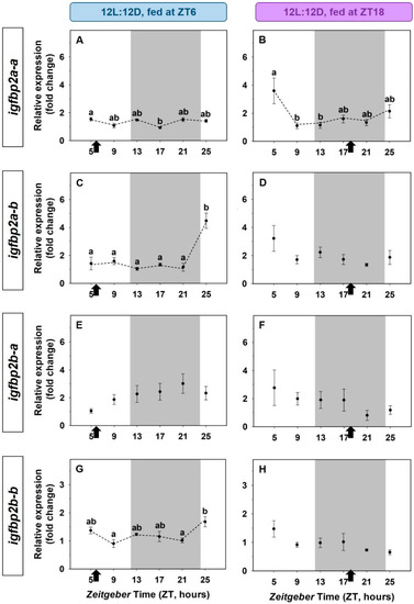 As a rule, the expression of the four paralogs of the igfbp2 did not fit sinusoidal 24-h rhythms, but some statistically significant differences were found through the 24-h cycle (Figure 7). The number of transcripts of igfbp2a-b and igfbp2b-b was significantly higher at the beginning of the light phase in fish fed at midday (Figure 7A,G), but this pattern disappeared in fish fed at mid-dark (Figure 7B,H).