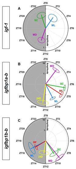 Figure 8 shows polar graphs with the amplitudes and acrophases derived from the cosinor analysis for the daily rhythms in igf-1 (A), igfbp1a-b (B) and igfbp1b-b (C) expression in the liver. The outermost ring indicates the time in zeitgeber units, and the acrophase (ϕ) is indicated by the angle of a vector whose length corresponds to the amplitude (A). It is clearly observed the 12-h shift in the daily rhythmic profile of igf-1 expression without alterations in amplitudes (Figure 8A). In the case of the igfbp1a-b (Figure 8B), it can be observed the amplitude changes induced by different feeding schedules and the shifted acrophases for the rhythmic profiles placed in the light phase of the photocycle (except for the rhythm under continuous darkness). Finally, in the random feeding group, a reduction of amplitudes and the shift of acrophases from dusk to the first half of the dark phase in the igfbp1b-b rhythms are shown in Figure 8C.