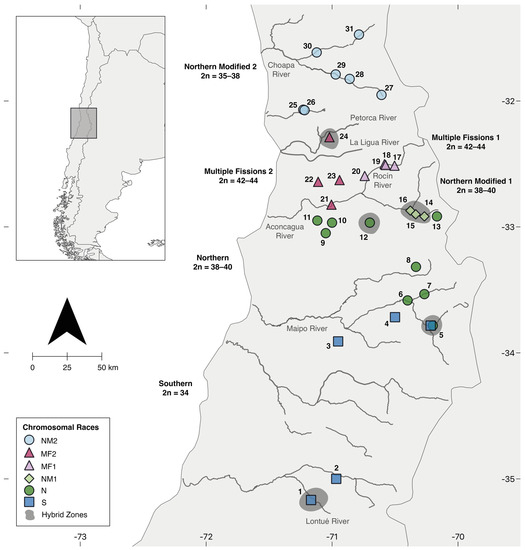 One chromosomally derived group in Liolaemus is the L. monticola complex. This complex is endemic to Chile and is widely distributed throughout the Andes, Coastal, and Transversal Mountain ranges, from 320 to 2000 masl, and between 31° and 35° south latitudes [33]. L. monticola is a suitable model to study chromosomal evolution because it displays different CR with elevated polymorphism and diploid chromosome numbers ranging from 2n = 32 to 44 [23]. At least five chromosomal races, whose complexity increases from south to north, have been recognized (Figure 1). The primitive race (P), 2n = 32 (considered ancestral in the Liolaemus), is located in the southernmost distribution [34]. The Southern race (S), 2n = 34, is located on the Andes and Coastal Mountain ranges between the Lontué River and the Maipo River [35,36]. The Southern race is characterized by stable fixed translocations between pairs 5 and 7 and one microchromosome pair addition. The Northern race (N), 2n = 38–40, is located from the northern Maipo River and Yeso River to the southern bank of the Aconcagua River [35,36]. The Northern race added centric fissions in pairs 3 and 4, a pericentric inversion in one fission product of chromosome 3, and one pair of microchromosomes. The Northern Modified 1 race (NM1), 2n = 38–40, is located north of the Aconcagua River and east of the Rocín River [37]. The Northern Modified 1 race includes two polymorphisms: an enlarged chromosome in pair 6 and a pericentric inversion in pair 7. Finally, the Multiple Fission race, 2n = 42–44, is found in the “Hierro Viejo” locality between the Aconcagua River and the Petorca River [38]. The Multiple Fission race presents novel polymorphic centric fissions for pairs 1 and 2 and a polymorphic pericentric inversion in one fission product of pair 2.