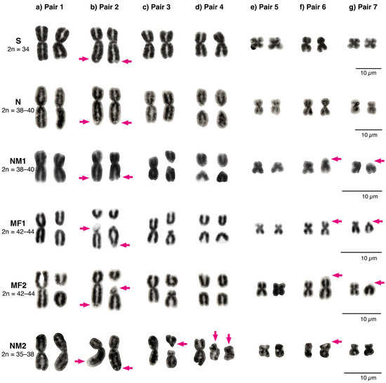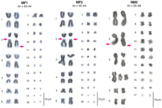 Lizards from the northernmost distribution of the L. monticola complex (25–31) were assigned to a new NM2 race, 2n = 35–38, which included two novel fissions in pairs 3 and 4. Pair 3 was polymorphic in most lizards with a metacentric chromosome and two fission products, one acrocentric and the other submetacentric. This rearrangement is different from the acrocentric and subacrocentric fission products described for pair 3 in the other races (N, NM1, MF1, and MF2) [35,36,37,38]. Pair 4 also presented a unique polymorphism, including a metacentric chromosome and two submetacentric fission products, instead of the common acrocentric fission products detected in pair 4 for the other races (except for the polymorphism found in hybrids between the Southern, 2n = 34, and Northern, 2n = 38–40, races [36,44]). Interestingly, this race shared a similar karyotype with the Southern race (Figure 2 and Figure 3) including a metacentric pair 1, a submetacentric pair 2, a metacentric pair 7, and 22 microcromosomes. This observation contrasts with the expected pattern of increased karyotype complexity from south to north. Furthermore, bivalents 1 and 2 in the NM2 race presented two to three chiasmata (Figure S1). The other races (N, NM1, MF1, and MF2) only present terminal chiasmata, except for the Southern race which shows several chiasmata in bivalents 1 and 2, as observed in the NM2 race [35,36].