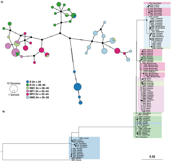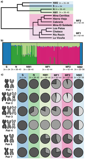 Allele frequencies were variable between the populations (Figure 4c). All individuals from the Southern race, 2n = 34, were fixed for the ancestral non-fissioned chromosomes in all pairs. The Northern race, 2n = 38–40, was characterized by a high frequency of the fission polymorphism on pair 3, and the fixation of the pair 4 fission. In the NM1 race, 2n = 38–40, an enlarged pair 6 and a pericentric inversion in pair 7 were characteristic of new rearrangements. The Multiple Fission races were characterized by high-frequency polymorphisms on the fission products of pairs 1 and 2. The main difference between both MF races was that those in the Andean locations (MF1, 2n = 42–44) contained the fission product of pair 2 with and without the inversion (52.77% and 43.52% of frequency, respectively), whereas the inversion of the fission product was almost fixed (96.49% of allele frequency) in the coastal locations (MF2, 2n = 42–44). Finally, the NM2 race, 2n = 35–38, presented a high frequency of the novel rearrangements for pairs 3 and 4, while also sharing the polymorphism for an enlarged pair 6.
