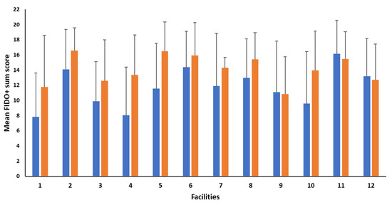 Descriptive statistics of the FIDO+ sum score variation among facilities pre- and post-transportation. Differences in FIDO+ sum score among facilities within and between time points (i.e., blue bars = pre-transportation: puppies of 8-week of age assessed at the CBK; orange bars = post-transportation: puppies assessed 48 h after arrival to the distributor).