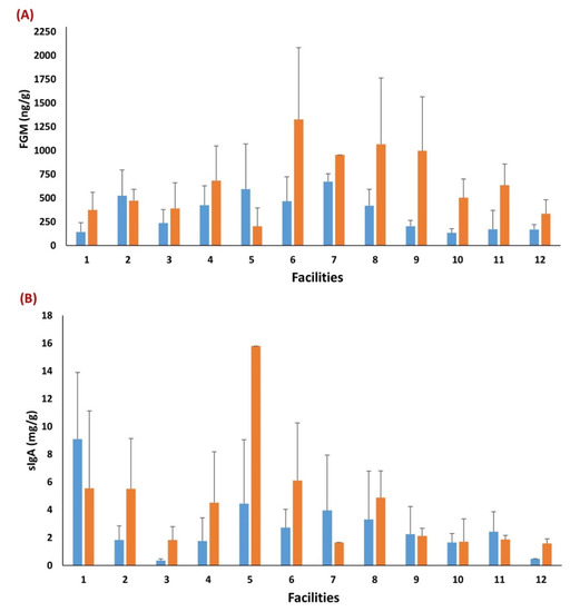 Descriptive statistics of the variation in focal puppies’ FGM (ng/g) and sIgA (mg/g) concentrations among facilities, pre- and post-transportation. Differences of FGM (A) and sIgA (B) concentrations among facilities within and between time points (i.e., blue bars = pre-transportation: puppies of 8-week of age assessed at the CBK; orange bars = post-transportation: puppies assessed 48 h after arrival to the distributor).