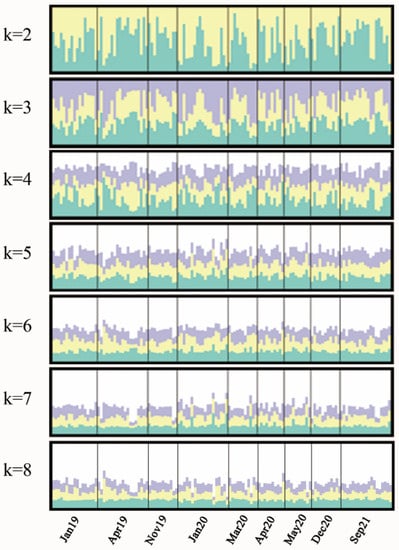 Bayesian clustering of Anguilla japonica temporal samples under assumption of K = 2–8, using STRUCTURE v2.3.4. Graphics were generated with DISTRUCT and CLUMPP. Jan19 = January 2019, Apr19 = April 2019, Nov19 = November 2019, Jan20 = January 2020, Mar20 = March 2020, Apr20 = April 2020, May20 = May 2020, Dec20 = December 2020, Sep21 = Sep 2021.