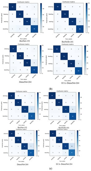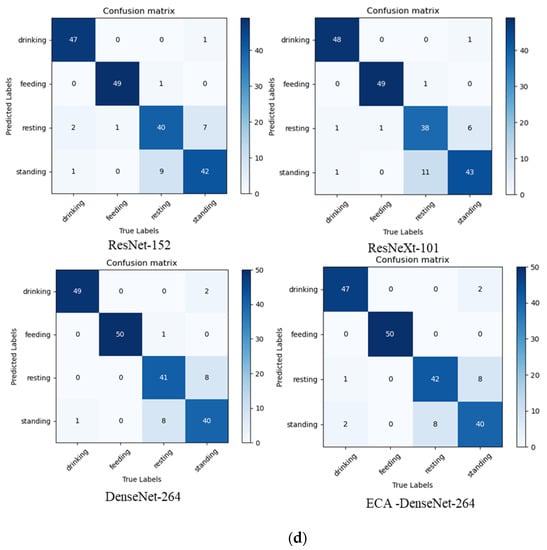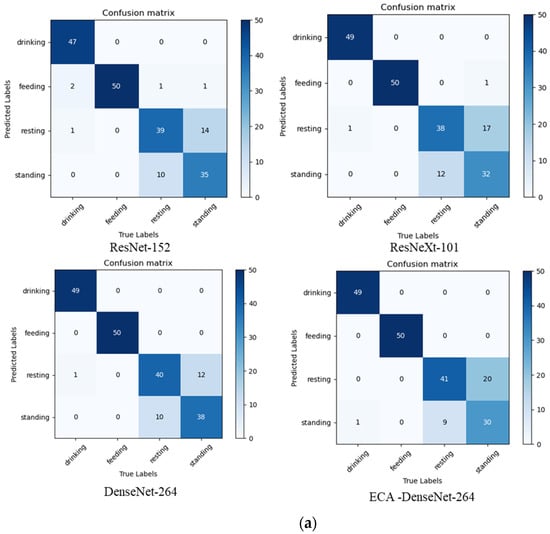 As it can be concluded by Table 5, ResNet-152, ResNeXt-101 and ECA-DenseNet-264 varied in their performances, while Densenet-264 was consistently the best for each dataset. To further analyze the performance of these four models for broiler behavior recognition, the confusion matrix is presented (Figure 2).