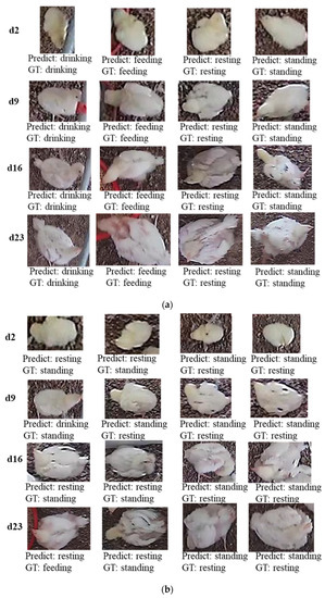 The broiler images contained broilers of different days, resulting in inconsistent size of the segmented images with the change of days when the broiler region was segmented. When the image was inputted into the CNN network, it was uniformly adjusted to 224 × 224, resulting in a wider or narrower broiler image. This adjustment affected the feature learning and behavior recognition effect of CNN network. In addition, there were multiple postures and angles of broilers in the scene that could lead to the misclassification of behaviors (e.g., Figure 3). Broiler behaviors were misclassified when the segmented image had a few feeders or drinkers. For example, the drinking behavior on d9 in Figure 3b was misclassified as a standing behavior. Additionally, when broilers are closer to feeders or drinkers but not feeding or drinking, misclassification of behaviors could occur (Figure 3b, d23). In addition, the shooting angle, broiler posture, and interference by objects can lead to misclassification of behaviors. For example, on d2, d9, d16, and d23 samples/images, the head of broilers were raising, lowering, or pecking feathers (Figure 3b), which resulted in the misclassification of the behaviors.