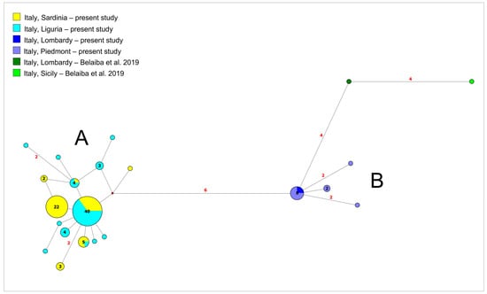 Median-joining network analysis. The network includes all the Italian sequences (from the present study and also from a previous study []) for the Control Region and 16s (merged in a concatenated dataset). Clusters A and B are described in the text. The number of mutations between sequences that are greater than n = 1 are reported on network branches. The number of individuals showing the same haplotype that is greater than n = 1 is reported inside the spots. Belaiba et al., 2019 in the legend corresponds to the reference [].