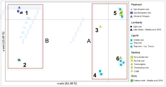 Results were consistent with the genetic structuring evidenced by network analysis, suggesting a divergence along the x-axis between two main groups (Groups A and B). Group A included individuals from Liguria and Sardinia with an internal, although poorly supported, sub-structuring. Indeed, an eastern Sardinian sample from the Rio Mannu di Lodè river (subgroup 3 in Figure 3) and a group of four samples from east Liguria (subgroup 4 in Figure 3) collected in the Entella river, slightly diverged from the remaining samples represented by two different clusters of sequences. The first of these two clusters (subgroup 6 in Figure 3) included only few samples from west Liguria (five individuals from Roja river), three individuals from central-west Sardinia: two from Rio Mannu di Scano Montiferrro river and a further sample from the Rio Mannu di Lodè river. The second cluster (subgroup 5 in Figure 3) of sequences was the larger in the graph and included individuals from all the Sardinian and Ligurian sampling sites.
