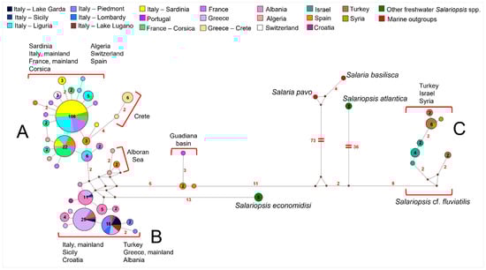 The network analysis performed on the Control Region dataset, including all the sequences available for the Mediterranean freshwater blennies (see Figure 4 and Table S2), showed the presence of three main clusters: cluster A, cluster B, and cluster C.