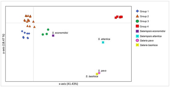 Salariopsis economidisi and S. atlantica, and the two marine outgroups, S. pavo and S. basilisca, set in the plot apart from the four S. fluviatilis/S. cf. fluviatilis groups.