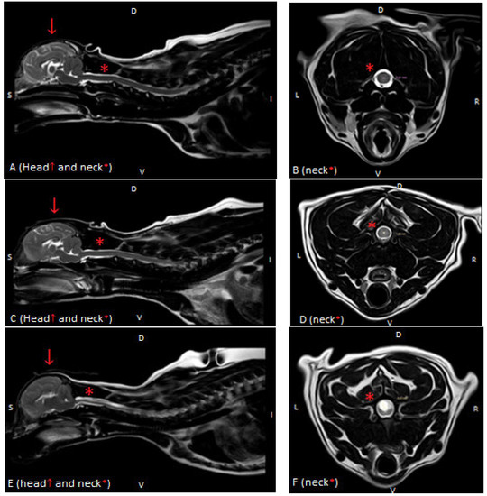 Syringomyelia (SM) is defined as an abnormal fluid cavity within the spinal cord. SM secondary to Chiari-like malformation (so-called CM-SM syndrome) is a severe spinal deformation leading to neurological symptoms. In dogs, this neurological disorder is most commonly observed in Cavalier King Charles Spaniel (CKCS) [1]. Several studies have shown that with age, the percentage of dogs that have visible MRI changes of CM-SM syndrome increase; however, the animals are often asymptomatic [2]. The most commonly reported clinical symptoms include vocalization, spinal pain, touch aversion, altered emotional state, sleep disturbance, head-scratching and phantom scratching [1,2]. CM-SM syndrome also occurs in humans. The incidence of CM-SM in humans is estimated at 8.4 new cases/year/100,000 people [3]. The imaging method of choice in the diagnosis of CM-SM is MRI. The most common MRI findings include occipital bone hypoplasia, central canal dilatation and syringomyelia. Owing to the non-specific nature of the disease, it is difficult to determine its severity based on clinical symptoms, especially when they have subtle characteristics in both human and veterinary medicine [1,2,3,4,5,6,7,8,9,10,11,12,13,14]. The reason for the low correlation between the severity of clinical symptoms and structural changes in the spinal cord visible on MRI is still unknown. Another challenge is a preventive prediction of disease in asymptomatic breeding dogs. Therefore, further research using advanced MRI sequences such as diffusion tensor imaging (DTI) is justified.