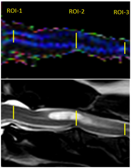 The correct positioning of each ROI was cross-checked on all available structural and DTI images. Care was taken to avoid partial volume effects with adjacent CSF or bony structures. FA and ADC metrics were calculated and averaged over the selected voxels for each ROI. ADC and FA values were not measured within the thoracic spinal cord because of the greater susceptibility to artifacts in these regions [23].