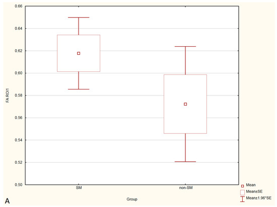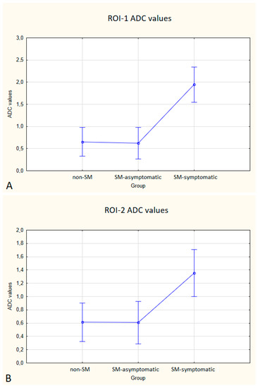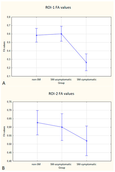 The Student’s t-test, for independent samples, was employed to compare age, body weight, and DTI parameters (ADC and FA values) between the non-SM and SM groups. One-way analysis of variance (ANOVA) was used to compare the differences between the average FA and ADC values between ROI-1, ROI-2, and ROI-3 in the non-SM (control) group, SM-asymptomatic and SM-symptomatic groups. If the null hypothesis of equality of all means was rejected, the post hoc cross-comparison test by Tukey’s HSD method was used. In all analyses, p < 0.05 was considered to be statistically significant.