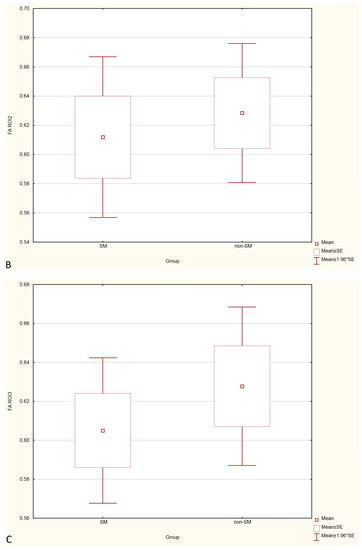 Boxplots comparing FA values in ROI-1 (A), ROI-2 (B), ROI-3 (C) between the SM and non-SM groups.