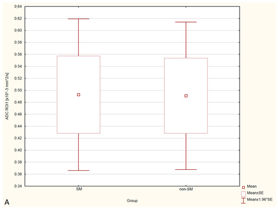 Boxplots comparing ADC values in ROI-1 (A), ROI-2 (B), ROI-3 (C) between the SM and non-SM groups.