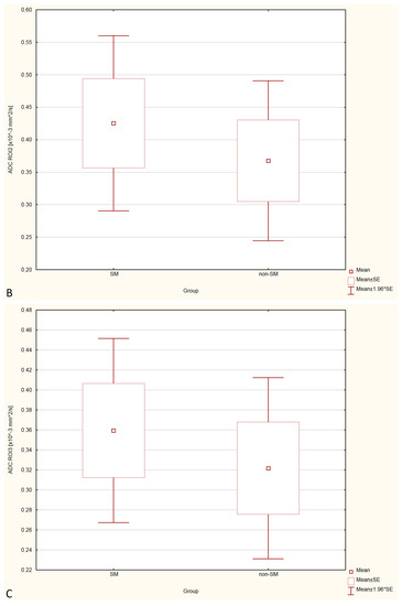 Statistically significant differences between non-SM and SM-symptomatic groups, and also between SM-asymptomatic and SM-symptomatic groups were found.