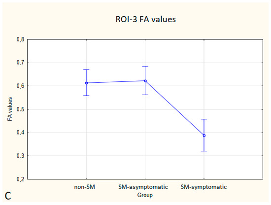 Boxplots comparing FA values in ROI-1 (A), ROI-2 (B), ROI-3 (C) between the non-SM, SM-symptomatic and SM-asymptomatic groups.
