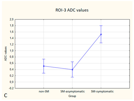 Boxplots comparing ADC values in ROI-1 (A), ROI-2 (B), ROI-3 (C) between the non-SM, SM-symptomatic and SM-asymptomatic groups.