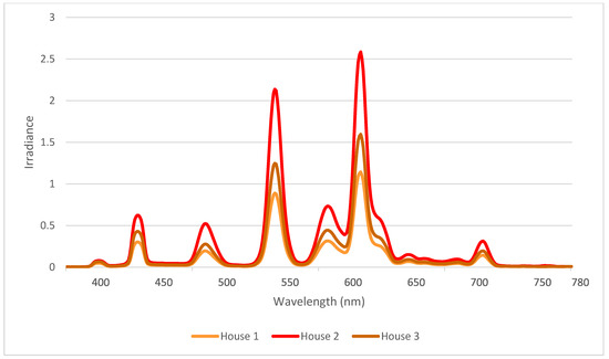 Spectral composition in the three houses with Evolys LED with UVA light sources based on standard spectrometer measurements (mean of 10 measurements per house).