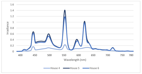 The spectral composition (mean of 10 measures/house) in the three houses with 965 CFL can be seen in Figure 2. The spectrum of the 965 CFL had two lower peaks at 450 nm (blue) and 500 nm (blue) and two higher peaks at 550 nm (green) and 620 nm (orange). The spectral composition had similar curves in houses 5 and 6, but the low amplitude in house 4 was likely affected by the lower light intensity (7.4 lux in house 4 vs. 26.8 and 28.1 lux in houses 5 and 6) (Figure 2).