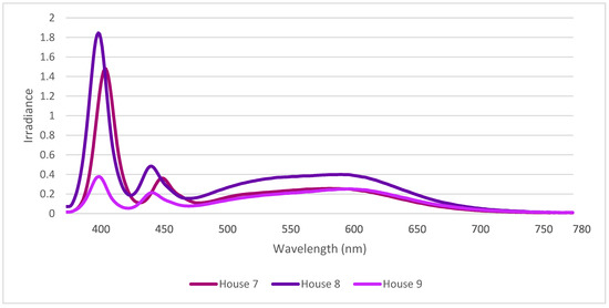 The spectral composition (mean of 10 measures/house) in the three houses with Evolys can be seen in Figure 3. The Evolys produces one sharp peak at 400 nm (violet) and a lower peak at 450 nm (blue). The spectral composition had similar curves in all three houses, but unlike houses with 965 or 830 light sources, the house with the highest light intensity (house 9, 30.5 lux) had the lowest amplitudes.