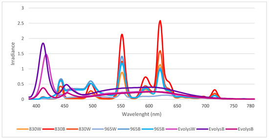 Spectral composition in all nine houses based on standard spectrometer measurements (mean of 10 measurements per house) in houses with 830 CFL, 965 CFL or Evolys light source and with either brown (B) or white (W) plumage.