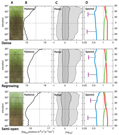 The circular fish-eye images were remapped to an equirectangular projection with the elevation angle on the y-axis and the azimuth angle on the x-axis. From the remapped images, pixel values were extracted for each 3° band of elevation angle and converted to photon radiance values for red, green and blue pixels. The conversion was based on a calibration of the camera model involving the full range of exposure times, ISO settings and F-stops of the camera and its fish-eye lens. For each scene, the converted pixel values were used to calculate, as a function of elevation angle, the median radiance in red, green and blue, as well as white light (including all three spectral bands). Apart from median radiances at each 3° band of elevation angles, we also calculated the range of values including 50% and 95% of the pixel values at either side of each median value. This range, computed for white light, gives a measure of the image contrast and serves as a proxy for the amount of the spatial structure visible at each elevation angle.