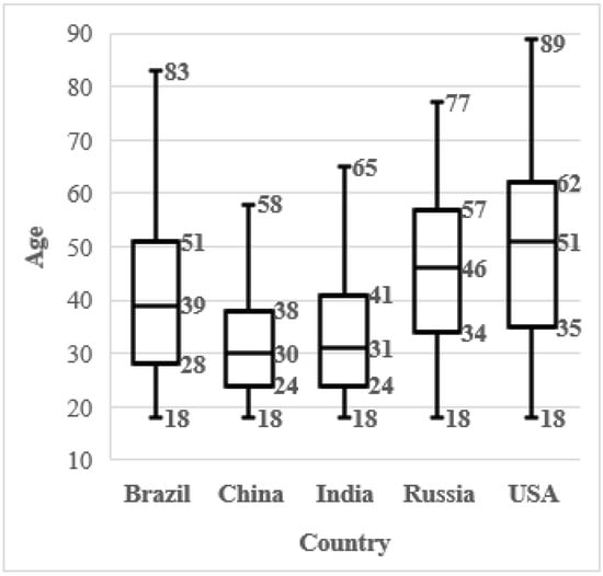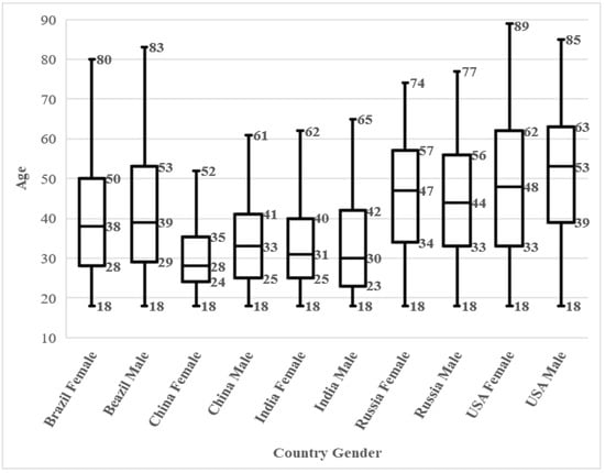 A total of N = 5172 individuals were entered in the analysis (Brazil n = 1027, China n = 966, India n =1004, Russia n = 1002, USA n = 1173), including n = 2586 men and n = 2586 women. The age distribution within countries is shown in the boxplots in Figure 1. The age distribution for each gender is shown in boxplots in Figure 2. As can be observed data is well balanced for gender, while for age it is slightly skewed towards younger ages in China and India. When considering all the three independent variables together we can observe a slight skewing towards older ages in Chinese men, while for other countries gender is well balanced (Figure 3).