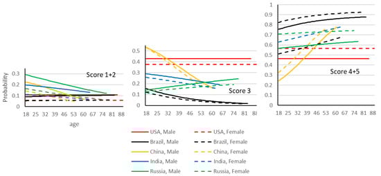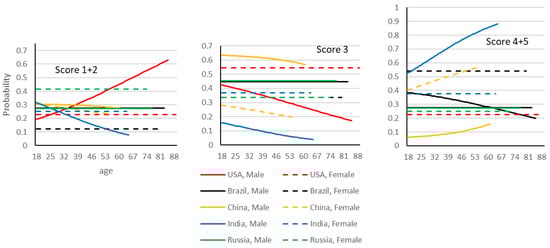 βm is the parameter associated with “Country” (Brazil, China, India, and Russia), being Xm the dummy associated with this parameter, taking the value one when the respective country is considered in the equation and zero otherwise. β1 is the parameter associated with the covariate “Age”, being X1 the age. β2 is the parameter associated with “Gender” (Man, Woman), being X2 the dummy associated and taking the value of one for men and zero for women. β3, β4, and β5 are the parameters associated with the two-way interaction terms (“Age × Country”, “Age × Gender”, and “Country × Gender”), and β6 is the parameter associated with the three-way interaction “Age × Gender × Country”.
