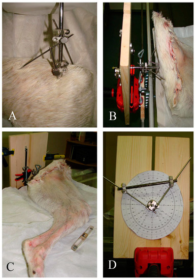 Limb positioning. Pins were used to secure the hemipelvis and to allow manipulation of the femur (A). The limb was subsequently connected to a table-mounted device (B,C) that allowed precise and controlled manipulation of the limb both in supination/pronation and in abduction/adduction (D).