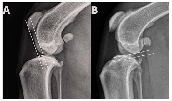 - Baroni, E.; Matthias, R.R.; Marcellin, D.J.; Vezzoni, A.; Stebbins, M.E. Comparison of radiographic assessments of the tibial plateau slope in dogs. Am. J. Vet. Res. 2003, 64, 586–589. [Google Scholar] [CrossRef] [PubMed]