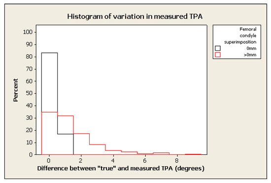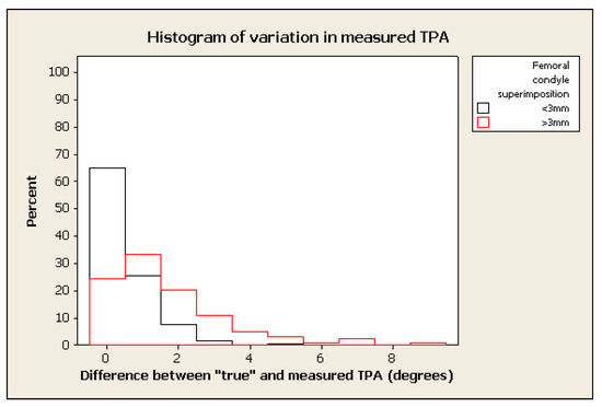 For radiographs with the femoral condyles perfectly superimposed, the consensus “true” TPA was recorded in 83.3% of limbs (Table 1), while no limb was measured as being more than 1° different from the “true” TPA.