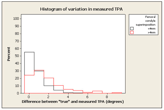 The frequency of measurement remained relatively high where the tolerated difference between “true” and “measured” TPA was set to 2°–3°, in spite of marked malpositioning (see examples of histograms for % change in figures below) (e.g., frequency > 70% within 2° of “true” TPA for radiographs positioned with 0.4 mm of femoral condylar non-superimposition). (Figure 3, Figure 4, Figure 5 and Figure 6).