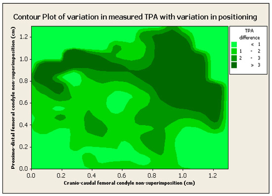 Contour plot of 3 dimensions: TPA angle difference (in degrees) with a gradient of greens, proximo-distal femoral condyle non-superimposition (cm) in the vertical axis and cranio-caudal femoral non-superimposition (cm) in the horizontal axis. Notice the general trend of a higher difference in TPA between “true” and measured TPA with increased non-superimposition in both planes (proximo-distal and cranio-caudal).